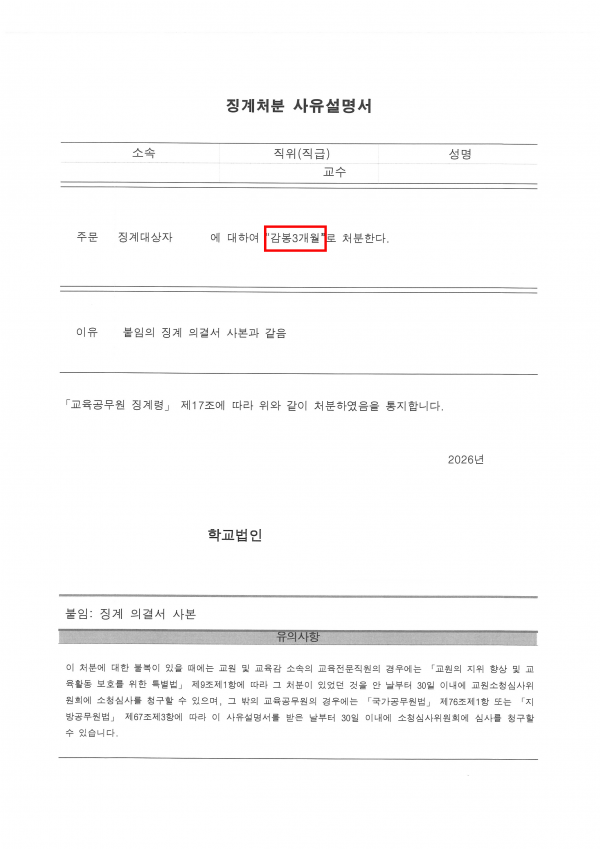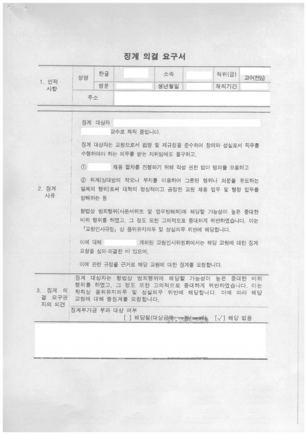 이후 대학 측은 의뢰인이 교수채용 절차를 진행하기 위해 작성권한 없이 명의를 모용하고, 위계로써 대학의 교원채용업무 및 행정업무를 방해하는 등 형법상 범죄행위(사문서위조, 업무방해죄)에 해당할 가능성이 높은 중대한 비위행위를 하였고, 그 정도도 고의적이고 중대하다며 교원인사규정상 품위유지의무 및 성실의무위반을 이유로 중징계의결을 요구하였습니다.