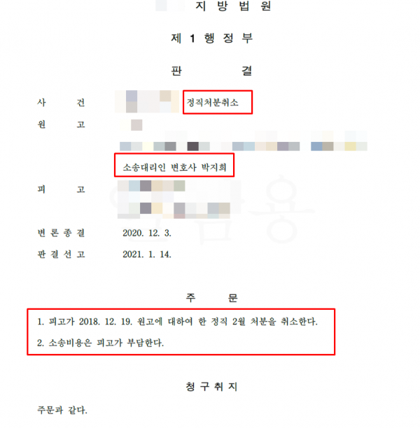 이 사건 담당 박지희 변호사는 의뢰인의 징계사유인 연구비 사적유용 및 위조 부분은 부당하면서 다투었고 이 사건 법원 피고가 원고에 대하여 한 정직 2월 처분을 취소한다는 승소 판결을 받게 되었습니다.