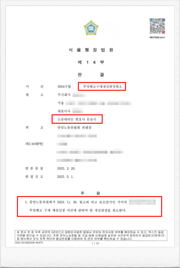 이에 의뢰인은 저희에게 사건을 의뢰하셨고, 결국 행정법원에 부당해고구제재심판정의 취소를 구하는 소송을 제기하였습니다.