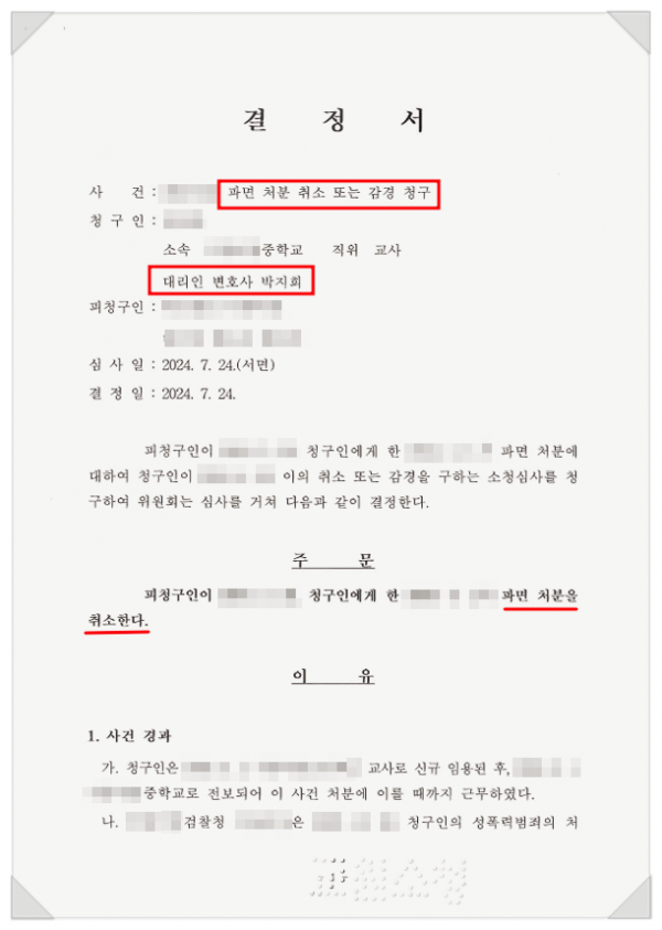 교원소청 심사 청구로 파면처분 취소 성공사례