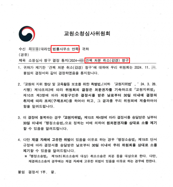 저희는 우선 이번 사건의 사실관계부터 면밀히 파악했습니다. 이후 우리 대법원 판례가 제시하는 성희롱 성립요건을 기준으로 사실관계를 분석한 결과, 해당 사안은 성희롱에 해당하지 않는다고 판단하였습니다. 그래서 징계위원회의 견책 결정은 위법하며 부당하다고 보아 견책처분의 취소 또는 감경을 구하는 교원소청심사를 청구하게 된 것입니다.
